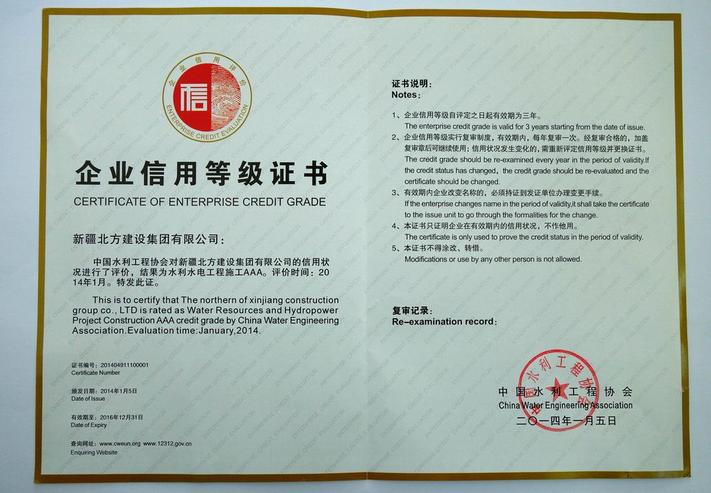 (通訊員 孟慶忠 景小軍 423日,兵團第七師北方建設集團收到了中國水利工程協(xié)會(huì )寄來(lái)的《關(guān)于公布全國水利建設市場(chǎng)主體信用評價(jià)復查結果的決定》(中水協(xié)【20149號)文件和企業(yè)信用等級證書(shū)及牌匾。文件和證書(shū)顯示,北方建設集團在全國水利施工企業(yè)信用評價(jià)中取得佳績(jì),喜獲全國水利建設市場(chǎng)主體信用等級評價(jià)的最高等級——“AAA信用評級。