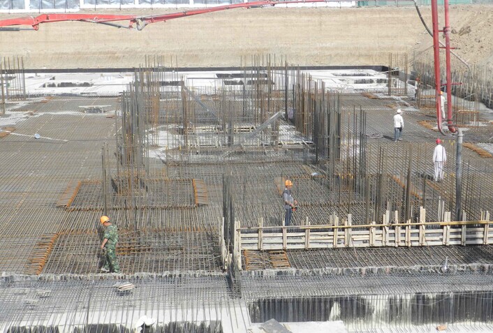 據悉,該工程的4#樓基礎筏板部分,鋼筋綁扎耗時(shí)600工時(shí),面積近1600平方,鋼筋用量300噸,混凝土用量2000立方,計劃現場(chǎng)同時(shí)采用兩輛泵車(chē)泵送,預計混凝土澆筑耗時(shí)40小時(shí)。