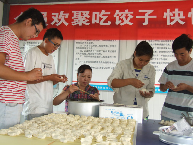活動(dòng)伊始,集團公司李主席親自帶領(lǐng)公司政工人員、項目人員包餃子,大家齊動(dòng)手,分工明確,有洗菜的、切菜的、和面的和拌餃子餡等,一切準備工作做好后,大家圍坐在一起開(kāi)始了包餃子。大約不到2小時(shí)的時(shí)間,就包好了近700個(gè)餃子。隨后,李主席又為大家煮餃子、盛餃子,與項目人員、勞務(wù)人員坐在一起津津有味的吃起了美味的餃子,共度中秋。